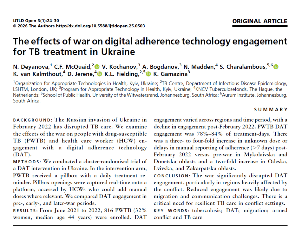 We conducted a cluster-randomised trial of a DAT intervention in Ukraine. In the intervention arm, PWTB received a pillbox with a daily treatment reminder. Pillbox openings were captured real-time onto a platform, accessed by HCWs who could add manual doses where relevant. We compared DAT engagement in pre-, early-, and later-war periods.